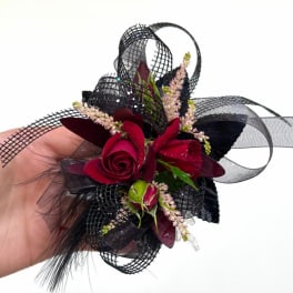 Price: $60.00Red and Black Wrist Corsage